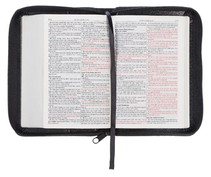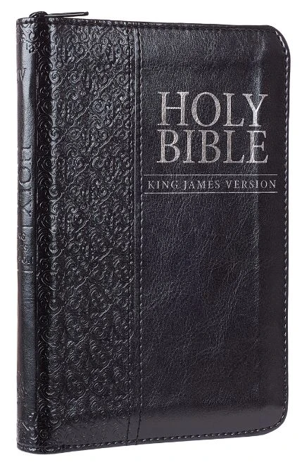 Our Black Mini Pocket Edition King James Version Bible zips up to carry easily. Its cover is constructed of quality man-made material imported from Italy, with the look and feel of real leather (trade name LuxLeather). Design features include a debossed decorative motif and silver foiled debossed title. Inside, you’ll find silver gilt-edged pages, a helpful Scripture verse finder, reader-friendly subheadings, a double-column format, a one-year Bible reading plan and an attached ribbon page marker. Our handy mini pocket-sized edition Bibles are easy to slip into a purse, pocket or backpack. Also perfect for the nightstand.Size: 4 1/8″ x 1 1/8″ x 6 1/8″Text Size 6pt1002 Silver Gilt-Edged PagesZipped ClosureFaux Leather MaterialLay-Flat SpineAttached Ribbon Page MarkerUnique Scripture Verse FinderOne-Year Bible Reading Plan