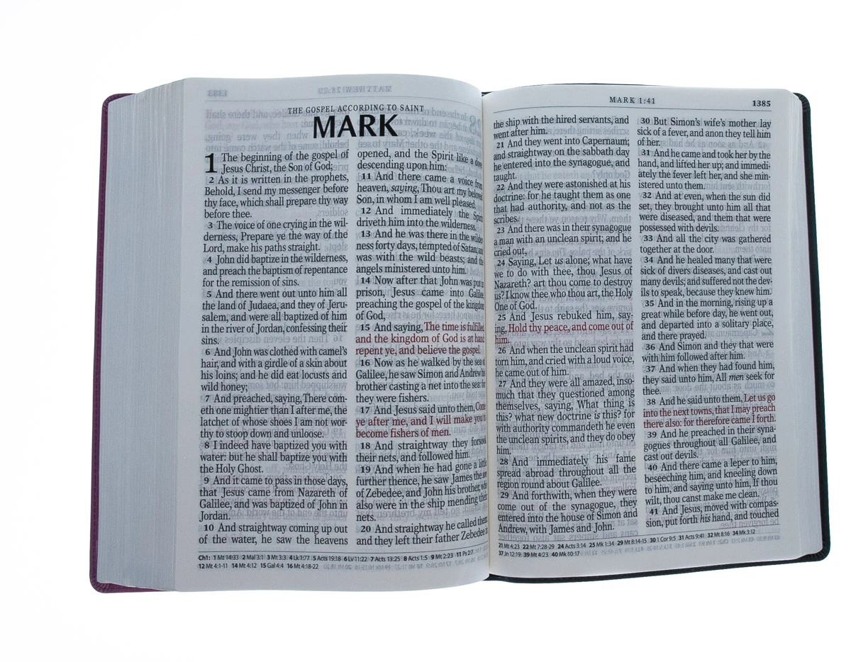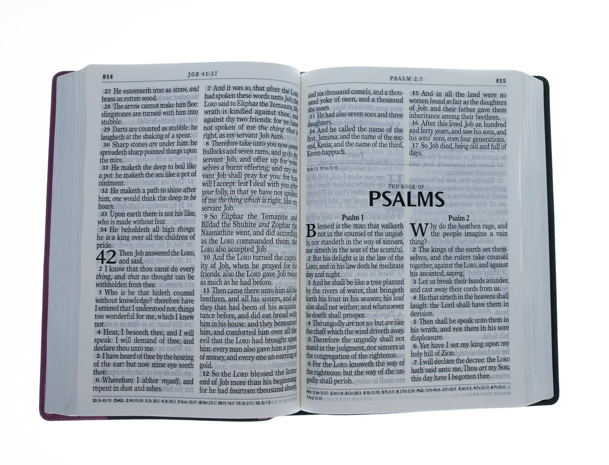 This King James Version Super Giant Print Bible is bound to become your chair or bedside companion. With an easy to read 17pt type in a double-column format and footnote cross-reference guide, concordance and topical verse finder, you’ll find it purposeful for study and readable without strain. The words of Christ are printed in red ink and there are 8 full-color annotated biblical maps. The edition includes the Epistle Dedicatory. The attractive two-tone Bible binding features title text debossed into the quality man-made material with the look and feel of real leather (trade name LuxLeather). Silver gilt-edged pages enhance the lovely simplicity of the design. Text Size 17pt 7 1/2 x 10 1/2 x 1 5/8 Inch 2.85 Pounds 1806 Silver Gilt-Edged Pages Faux Leather Flexcover Bound Lay-Flat Spine Attached Ribbon Page Marker Words of Christ in Red Ink Footnote Verse Cross-Reference Guide Concordance Unique Scripture Verse Finder One-Year Bible Reading Plan 8 Full-Color Maps