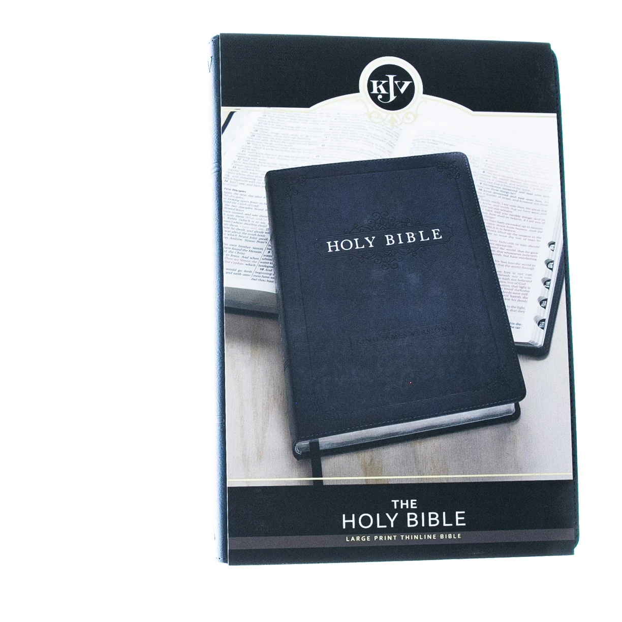 Understated elegance, a universally popular color, and a thin profile make the Blue Faux Leather Large Print Thinline King James Version Bible with Thumb