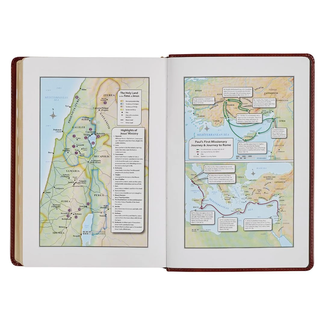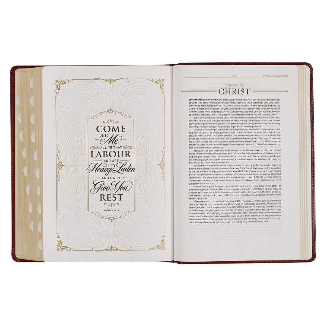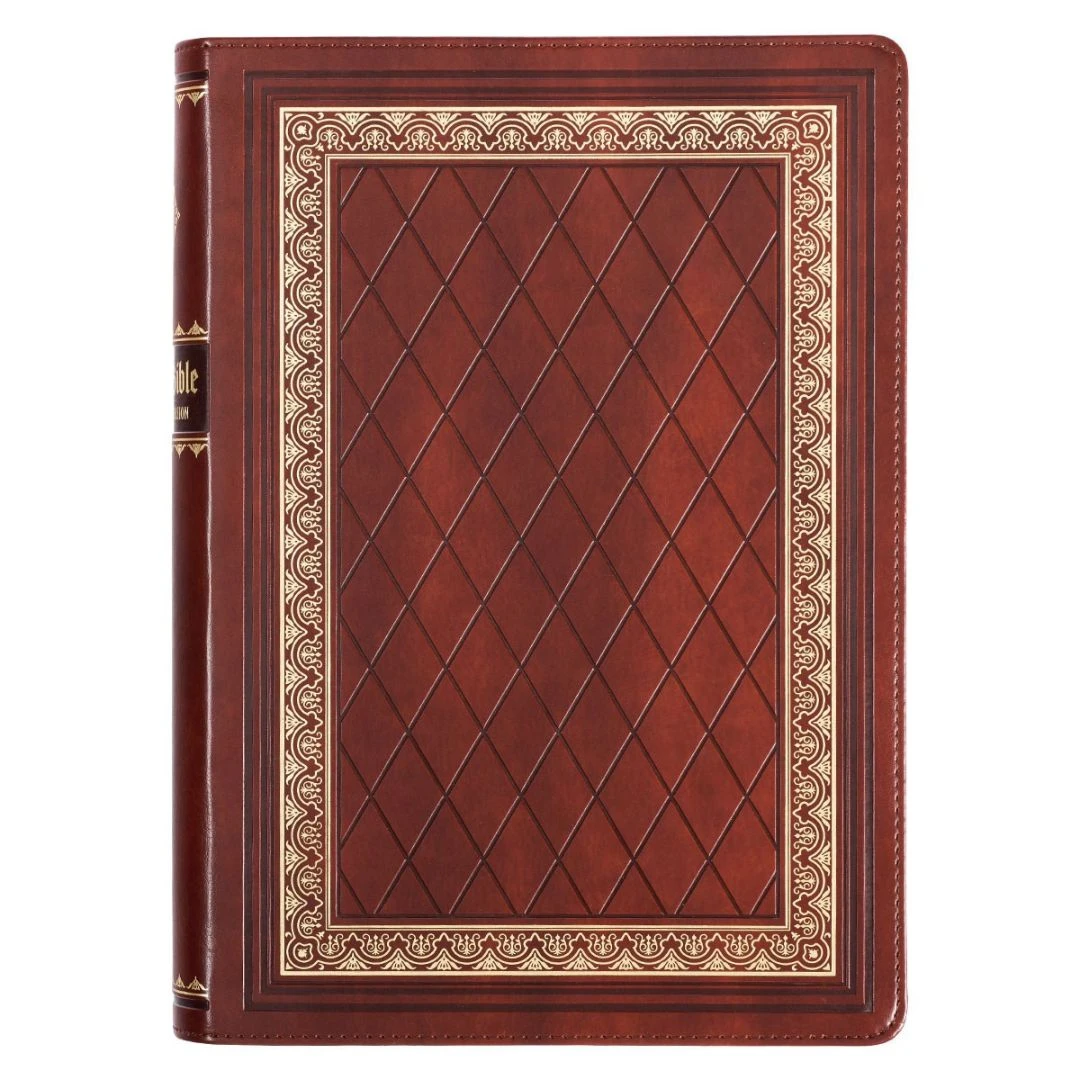 The exquisite design and rich content of the Diamond Grid Saddle Tan Faux Leather King James Version Study Bible with Thumb Index make this updated KJV