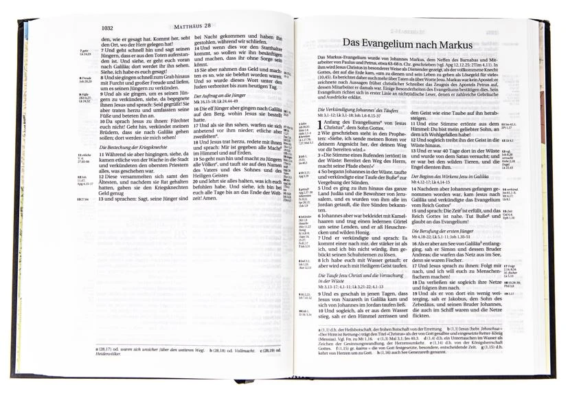 Diese volkstĂĽmliche, gut verständliche Bibel ist bekanntfĂĽr ihre Treue zum Urtext und ihre seelsorgerliche Sprache. Sie eignetsich – je nach Ausgabe – hervorragend sowohl als missionarische Bibel als auchals Studienbibel. Zahlreiche Erklärungen biblischer Wörter inFuĂźnoten sowie ein ausfĂĽhrlicher Anhang mit Sach- undWorterklärungen, ĂĽbersichtstabellen und Karten bieten Hilfen fĂĽrden Bibelleser.This popular, understandable Bible is well knownfor their loyalty to the original text and their pastoral language. It is suitabledepending on the edition – excellent as both a missionary Bible andas a study bible. Numerous explanations of biblical words inFootnotes and a detailed appendix with factual andWord explanations, overview tables and maps offer help forthe Bible reader.