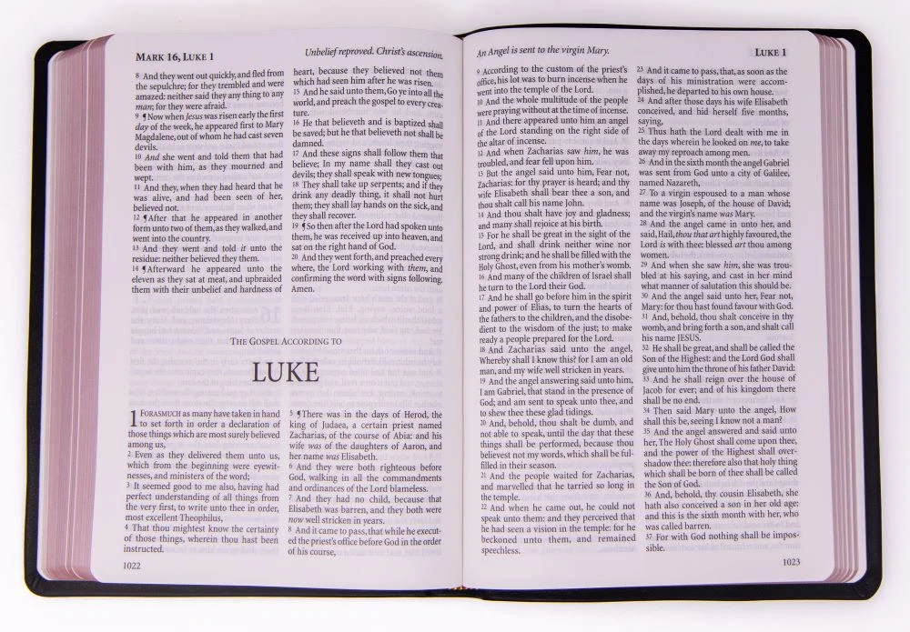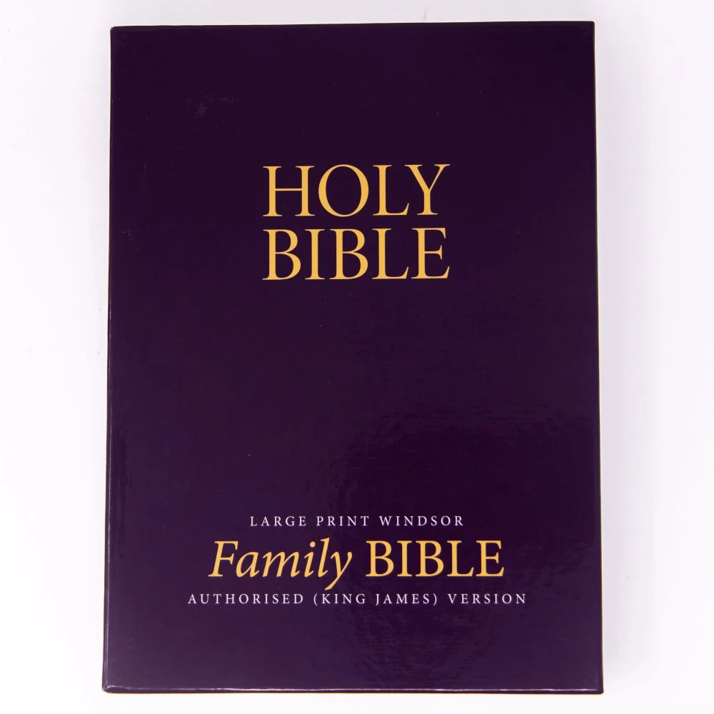 Large print Bible without references in calfskin leather. Family pages on the front endpapers for Family records to be maintained. Distinctive clear text