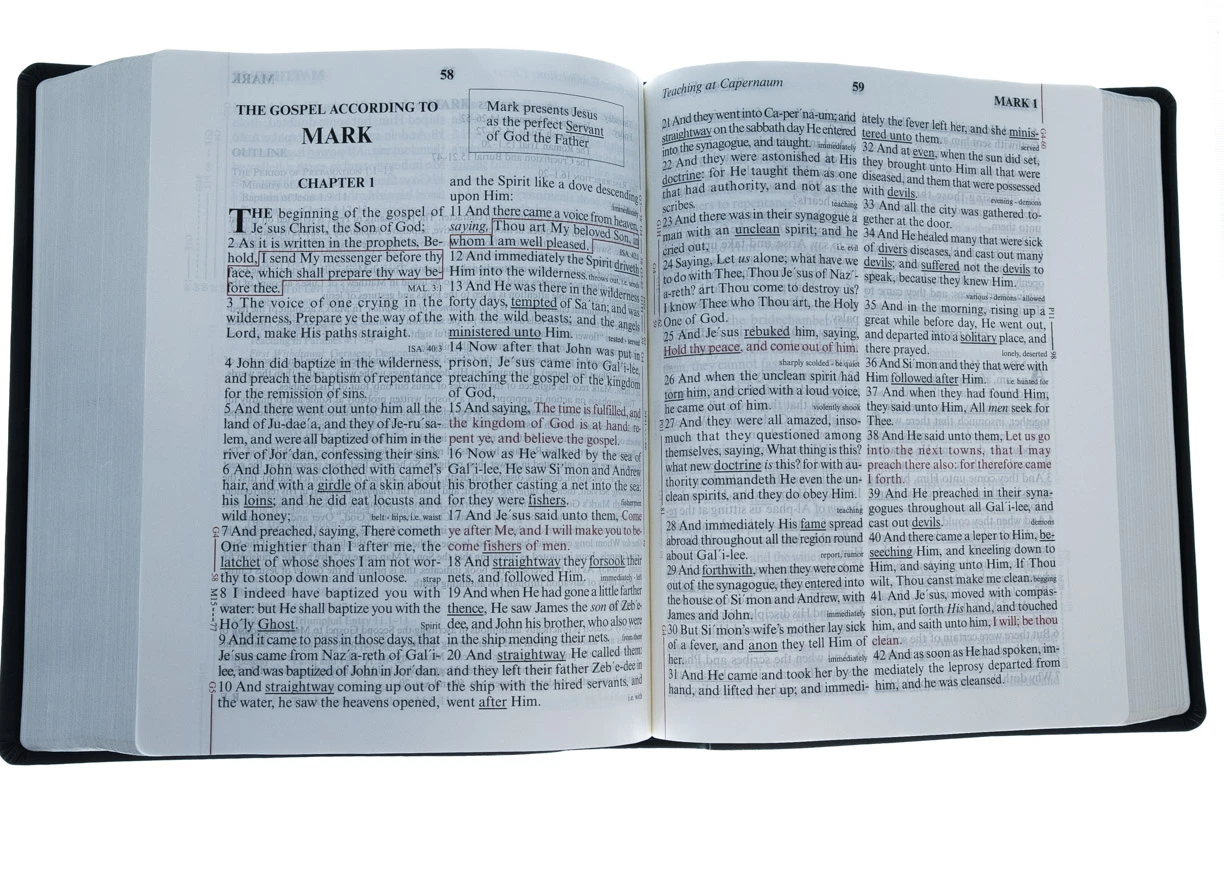 The King James Version is the most published and printed version of the Bible to this day. For over four centuries, the Word of God was defined as the King James Version of the Bible. No other version has ever matched the beauty of its writing or the depth of its meaning. The KJV Sword Study Bible® contains many unique and distinctive features and resources, including the following:Words of God highlighted in red in the Old TestamentWords of Jesus highlighted in red in the New TestamentDifficult terms underlined and explained at the end of the verseThematic study guide with over three thousand margin notes covering more than ninety topics, providing a years’ worth of study that takes the reader through the Bible from cover to coverOutlines and summaries at the beginning of each bookExtensive treasury of biblical information on history, science, prophecy, and moreTopical concordance and mapsFifteen point, large print type size