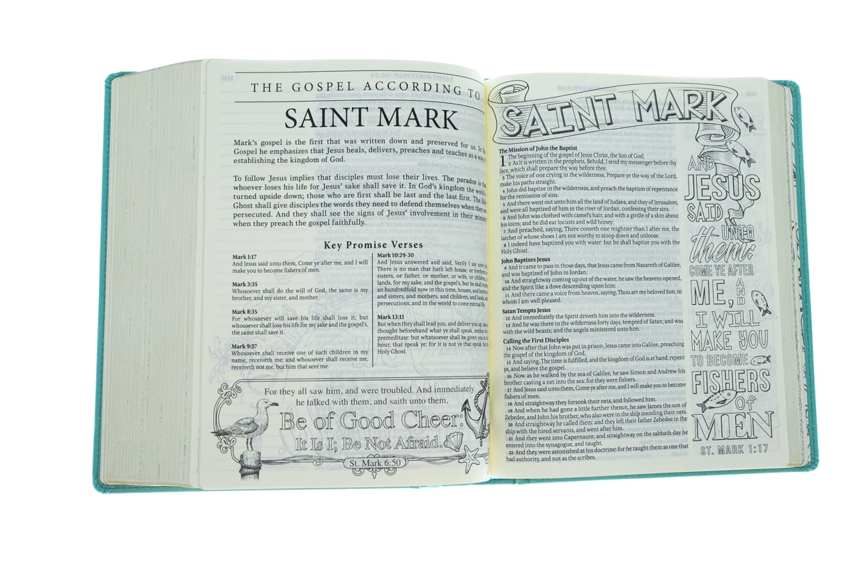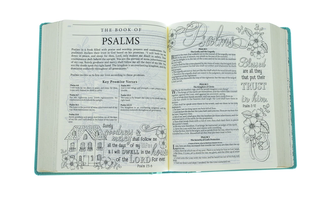 Decorate the designs and line-art drawings in the Teal Faux Leather Hardcover KJV My Promise Bible to engage with the Bible’s promises in a creative way.
