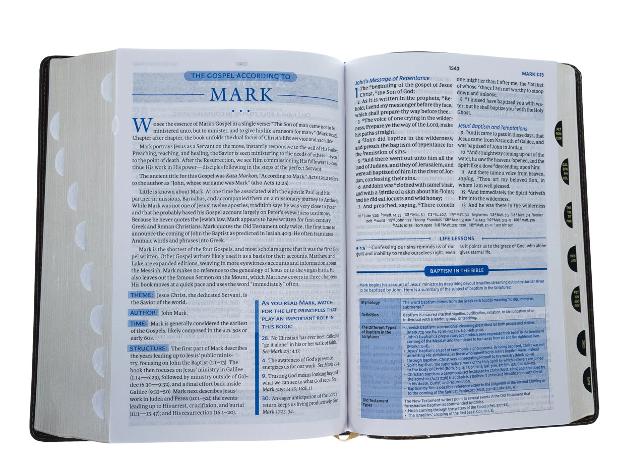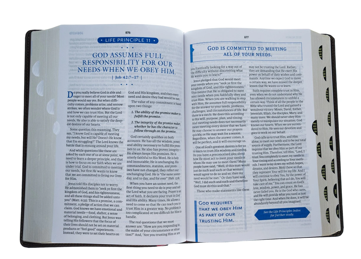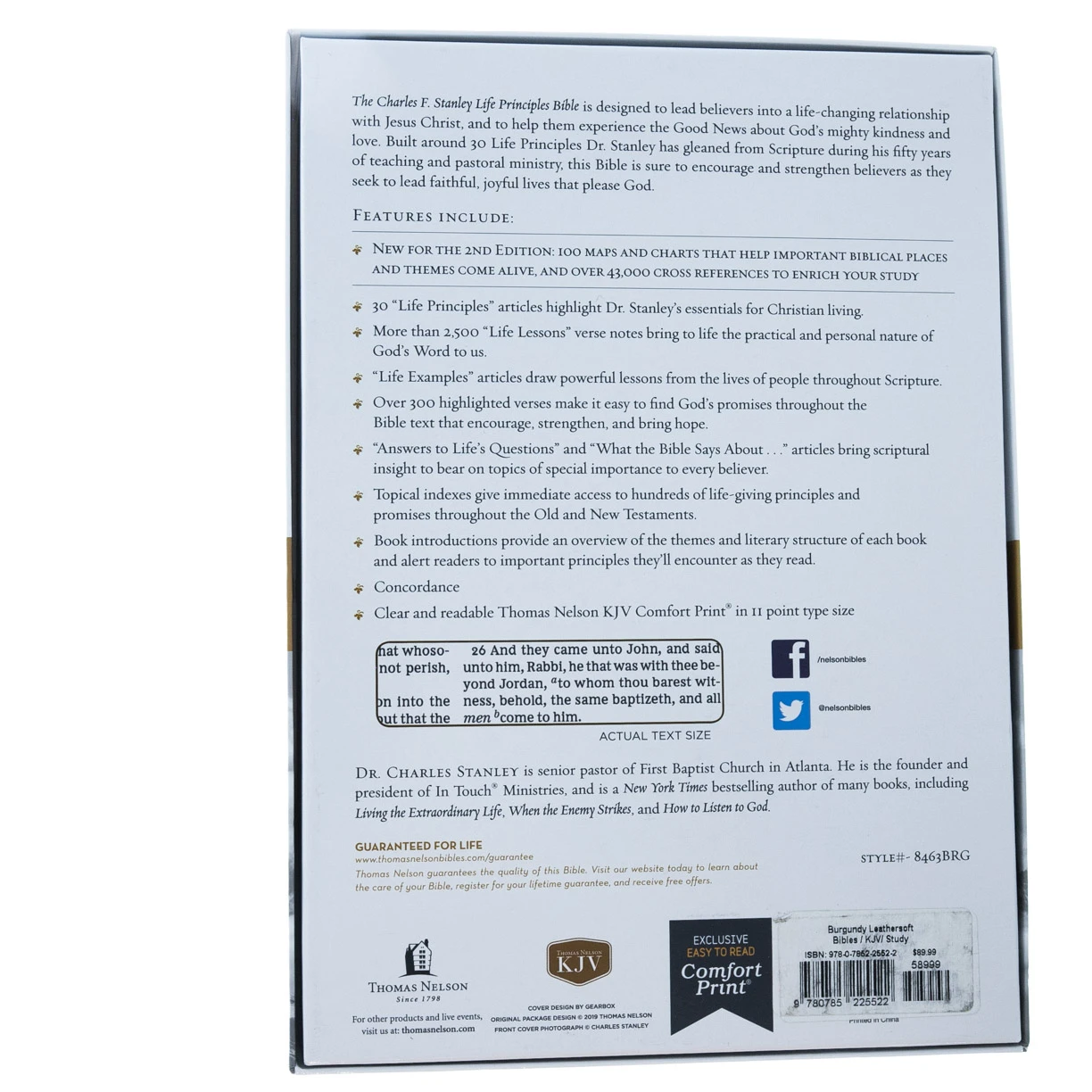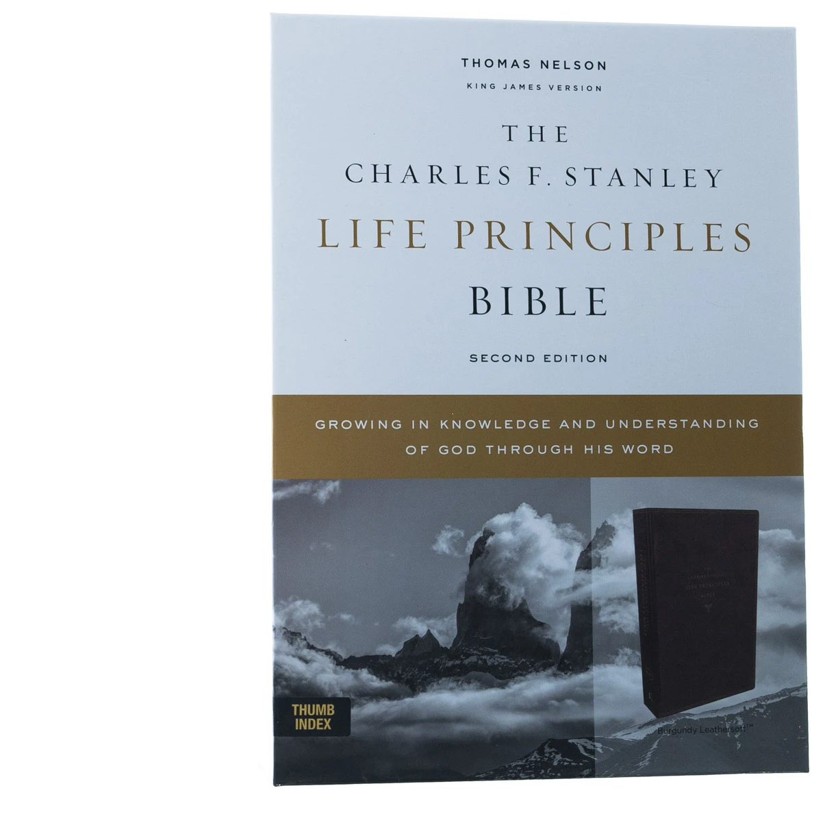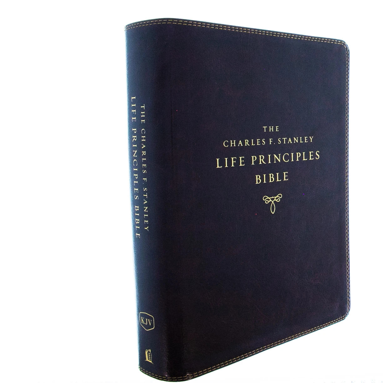 The Charles F. Stanley Life Principles Bible is designed to lead believers into a life-changing relationship with Jesus Christ, and to help them experience the Good News about God’s mighty kindness and love. Built around 30 Life Principles Dr. Stanley has gleaned from Scripture during his fifty years of teaching and pastoral ministry, this Bible is sure to encourage and strengthen believers as they seek to lead faithful, joyful lives that please God.With over one million Life Principles Bibles sold to date, the updated second edition is the best way to experience this bestselling classic—with a completely new design featuring Thomas Nelson’s KJV easy-to-read Comfort Print® typeface, 100 specially designed maps and charts that bring biblical places and themes to life, and over 43,000 cross references to enrich your study of the Word.Features include:30 Life Principles articles highlight Dr. Stanley’s essentials for Christian livingMore than 2,500 Life Lessons verse notes bring to life the practical and personal nature of God’s Word to usLife Examples articles draw powerful lessons from the lives of people throughout ScriptureOver 300 highlighted verses make it easy to find God’s promises throughout the Bible text that encourage, strengthen, and bring hopeAnswers to Life’s Questions and What the Bible Says About articles bring scriptural insight to bear on topics of special importance to every believerTopical indexes give immediate access to hundreds of life-giving principles and promises throughout the Old and New TestamentsBook introductions provide an overview of the themes and literary structure of each book, and alert readers to important principles they’ll encounter as they readNew for the 2nd Edition, 100 maps and charts that help important biblical places and themes come alive, and over 43,000 cross references to enrich your studyConcordanceClear and readable Thomas Nelson KJV Comfort Print® typeface11-point print size