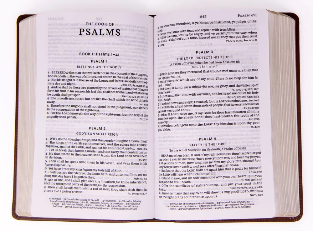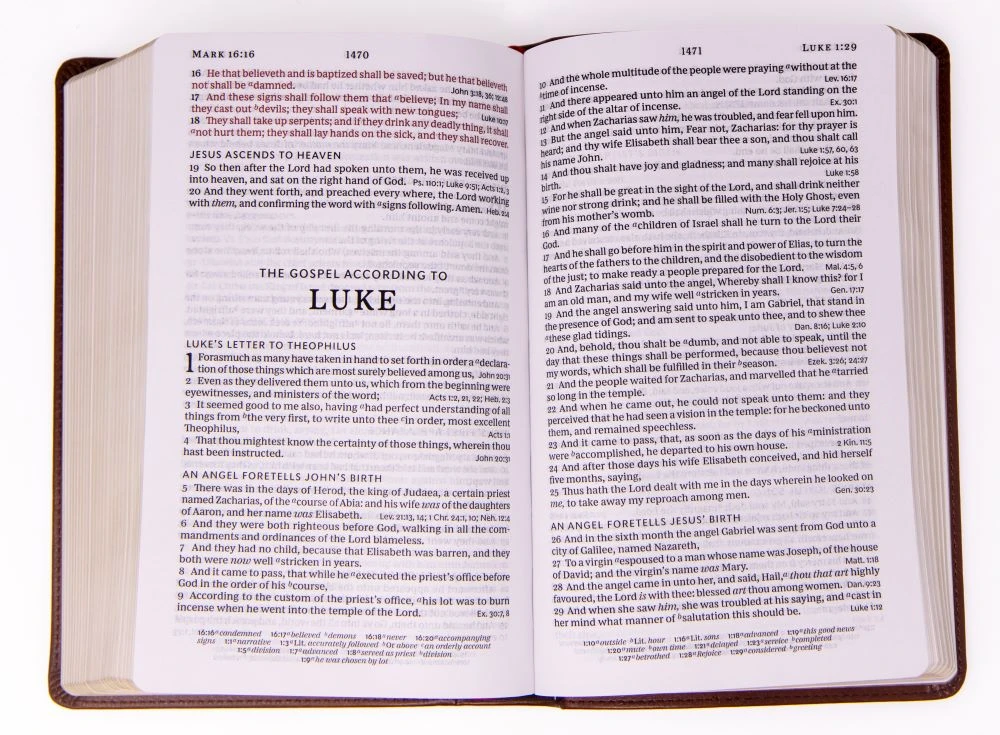 This KJV Bible contains a unique and stunning layout for reading and exploring God’s Word with ease. With a single-column, line-matched format in large